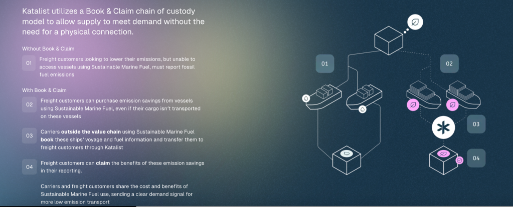 Katalist, launched in November by RMI and the Mærsk Mc-Kinney Møller Center for Zero Carbon Shipping (not affiliated with the shipping company), offers a type of environmental attribute credit that can be used to offset emission. The registry uses a concept called “book and claim,” the same approach being used to encourage adoption of sustainable aviation fuel and to support trading of renewable energy certificates. Companies get credit for the emissions reductions made possible through projects they support, even though they haven’t physically taken delivery of that energy.